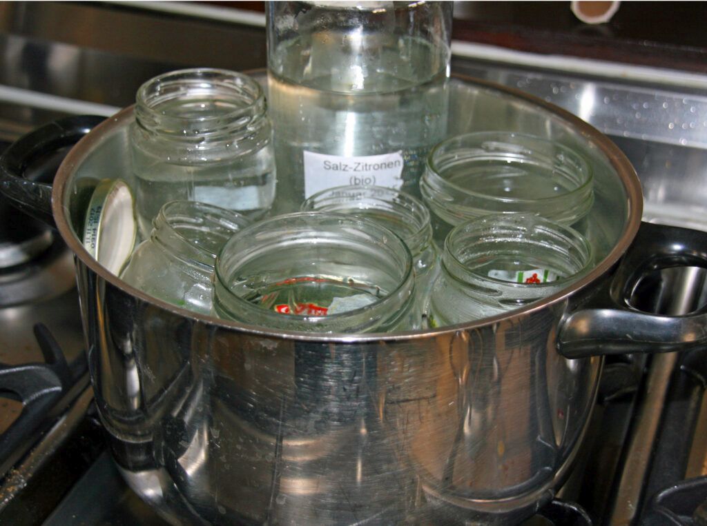1 l Wasser zum Kochen bringen, 1 EL Salz darin auflösen, 1 Zitronen auspressen und den Zitronensaft zugeben. Das kochende Wasser mit Salz und Zitronensaft über die eingeschichteten Zitronen geben und das Glas schließen.