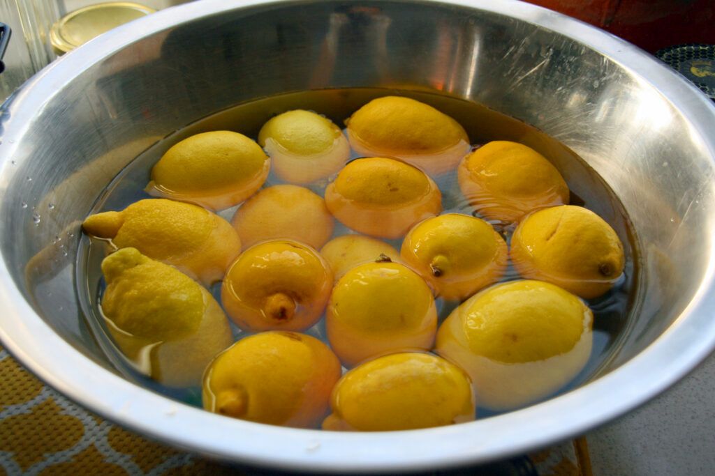 Zitronen heiß waschen und mit einer Bürste abreiben. In eine Schüssel kaltes Wasser legen und 3 Tage mit Wasser bedeckt (eventuell mit Teller unter Wasser halten) stehen lassen.