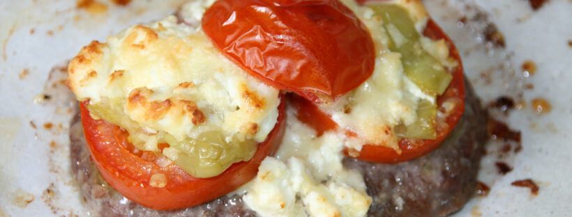 Rinderhackscheiben auf ein mit Backpapier ausgelegtes Backblech legen. Salzen und pfeffern. mit je 2 Tomatenscheiben belegen. Peperoni in Streifen schneiden, auf die Tomaten legen. Feta und Gouda mischen, je 2 EL von der Käsemischung auf die Hackscheiben, mit einer Rand-Tomatenscheibe abschließen. Im Backofen bei 180-200 ° Grad backen, bis der Käse goldbraun wird.