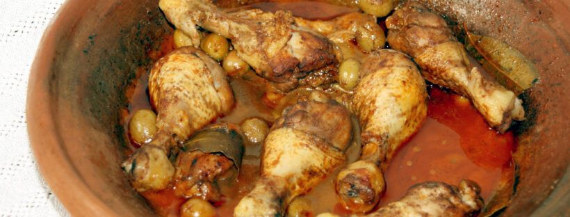Alle Zutaten (außer Lorbeer) vermischen, bis eine schöne rote Paste entstanden ist. Die Hühnerteile damit einpinseln und ca. 1 Std. einziehen lassen. Dann Hühnerteile mit den Lorbeerblättern in Olivenöl in einer Pfanne scharf anbraten. In die Tadjine legen, gehackte Oliven und 2 TL Xucker dazu. Etwas Wasser oder Brühe aufgießen, Deckel drauf und ca. 40 Min. auf kleiner Flamme schmoren lassen.Die restlichen Oliven die letzten 5 Minuten noch mitköcheln lassen.