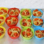 Alles bis auf die Kirschtomaten im Mixer zerkleinern und mischen. Eßlöffelweise in die Muffinsförmchen füllen. mit drei Tomatenhälften dekorieren.
