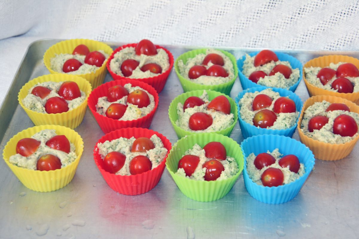 Alles bis auf die Kirschtomaten im Mixer zerkleinern und mischen. Eßlöffelweise in die Muffinsförmchen füllen. mit drei Tomatenhälften dekorieren.