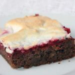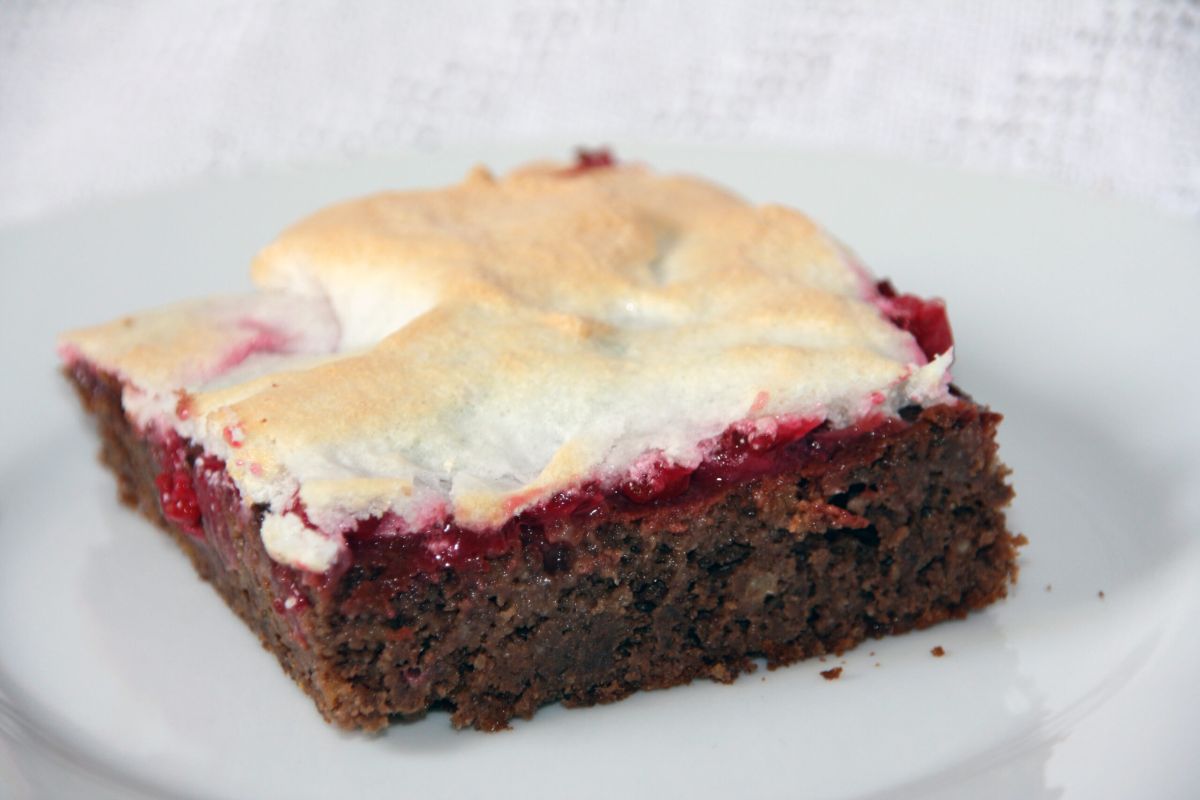 Grundlage ist der Teig für den Schokolinsenkuchen, der diesmal nicht in der Springform, sondern in einer eckigen Form gebacken wird (Backzeit ca. 35 Minuten bei 175°). Abkühlen lassen. Auf den abgekühlten Kuchen kommt die Johannisbeermasse und oben drauf das Baiser.