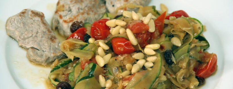 Die Zwiebel-Rosinen-Tomatenmischung unterheben. Mit Pinienkernen (die man ebenfalls noch antrösten könnte) bestreuen und mit Parmesan servieren.