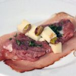 pro Filet 1 Käsestreifen (1/2 cm auf 1/2 cm in der Dicke) und 4 Pistazien