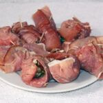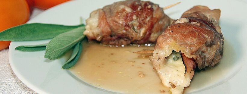 Schinkenscheiben auflegen, je ein Filet darauf legen, schwach salzen und pfeffern, mit Salbei bestreuen, den Käsestreifen mit den Nüssen auf das Filet legen, alles einrollen, mit einem Zahnstocher feststecken. Von 2 Seiten anbraten, mit Marsala und Fond ablöschen, aufkochen, bei geschlossenem Deckel 15-20 Min auf kleiner Flamme gar ziehen lassen.