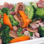 Chorizo und Schinken in Kokosöl anbraten und über dem Broccoli verteilen.