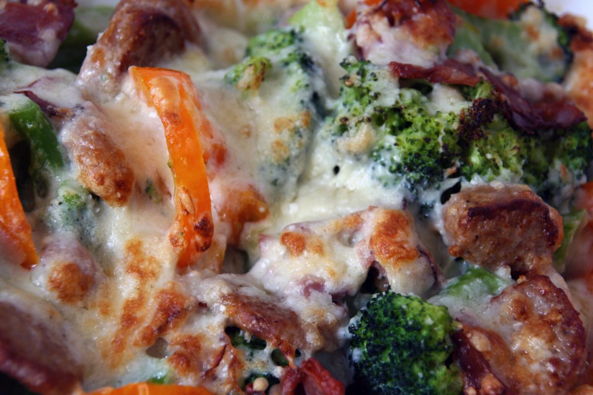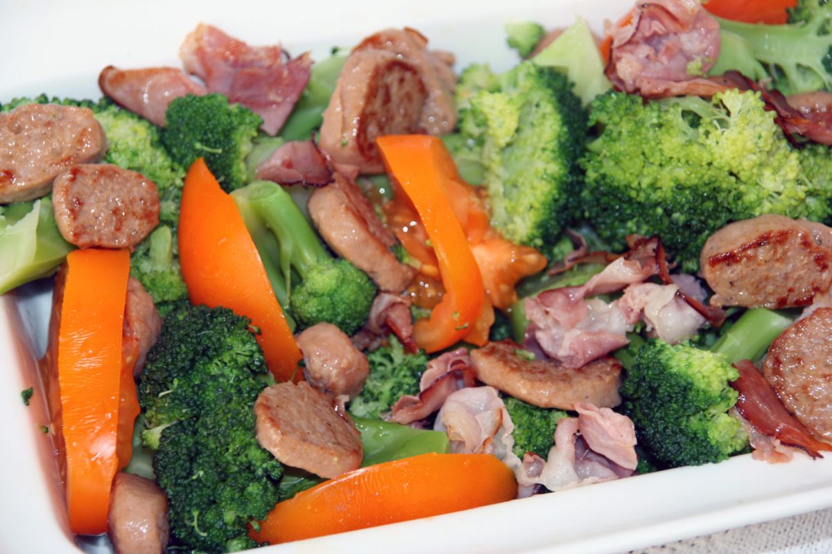 Chorizo und Schinken in Kokosöl anbraten und über dem Broccoli verteilen.