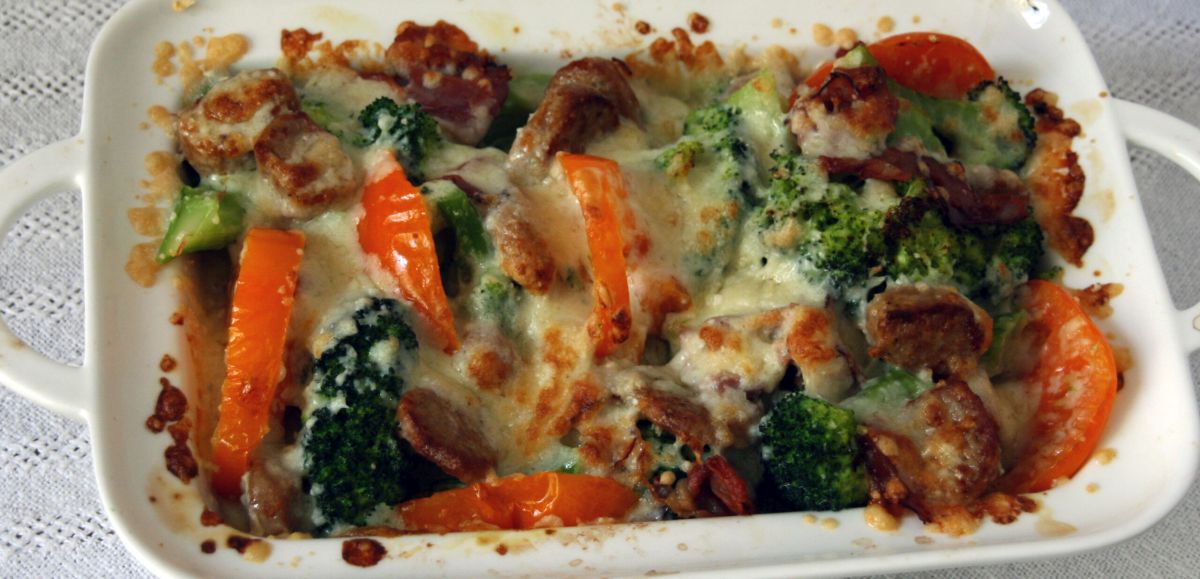 Heute waren es zwei Strünke Broccoli, 1 übriggebliebene Chorizo-Bratwurst, 3 Scheiben Schwarzwälder Schinken und eine Handvoll Käsereste, darunter Ziegengouda, baskischer Schnittkäse, etwas Parmesan und ein junger Bergkäse.