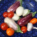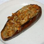 In eine Auflaufform füllen. Im verbliebenen Fett die Zwiebel goldbraun braten, dann das kleingehackte Auberginenfleisch dazugeben, bis es weich und gar ist. Mit den anderen Zutaten vermischen und die Auberginen damit füllen. Obendrauf etwas Olivenöl träufeln. Im Ofen bei ca. 200° gratinieren, bis sich eine Kruste zu bilden beginnt.