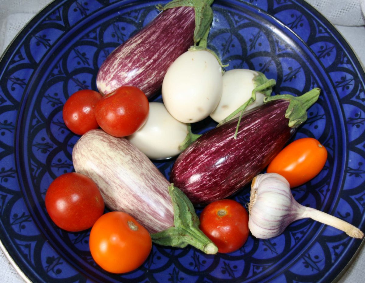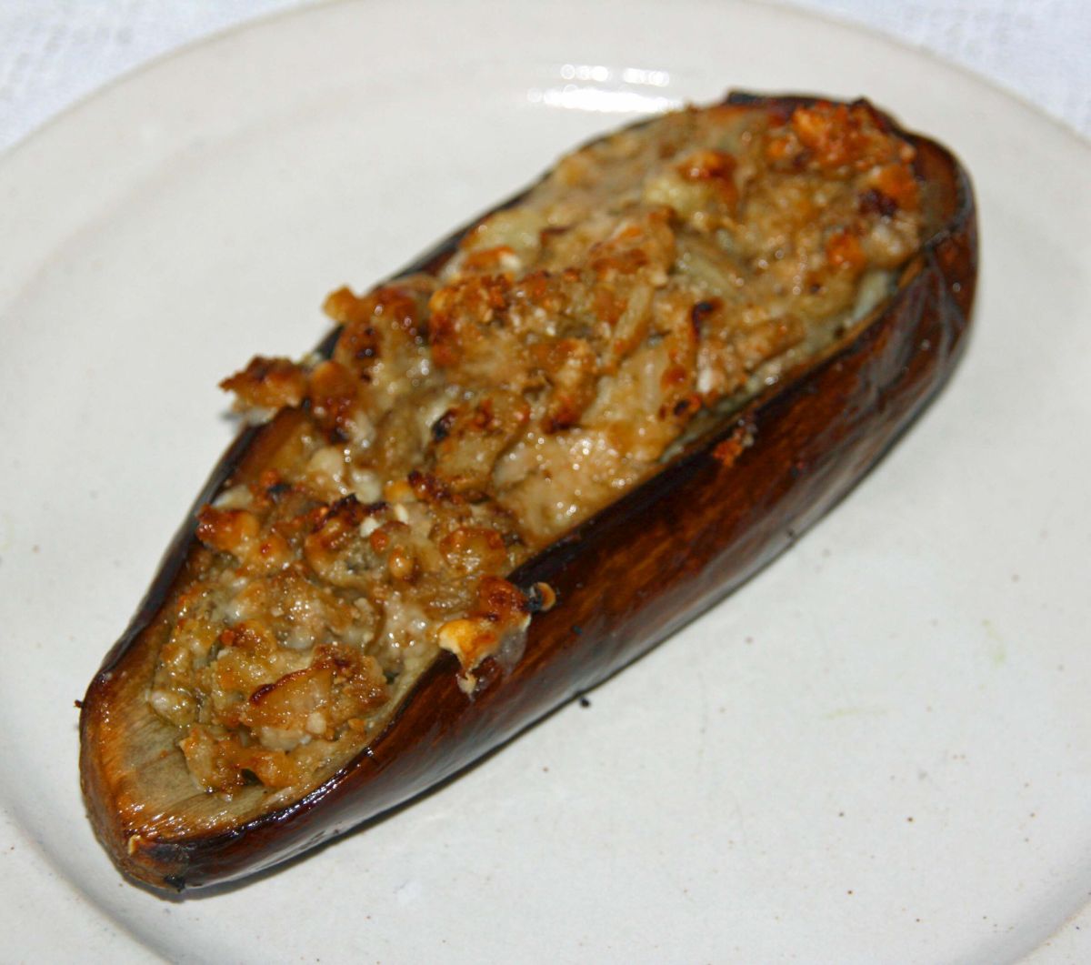 In eine Auflaufform füllen. Im verbliebenen Fett die Zwiebel goldbraun braten, dann das kleingehackte Auberginenfleisch dazugeben, bis es weich und gar ist. Mit den anderen Zutaten vermischen und die Auberginen damit füllen. Obendrauf etwas Olivenöl träufeln. Im Ofen bei ca. 200° gratinieren, bis sich eine Kruste zu bilden beginnt.
