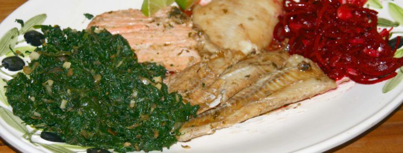Gemischte Fischplatte mit Spinat und frischem Rote Bete Salat Low Carb