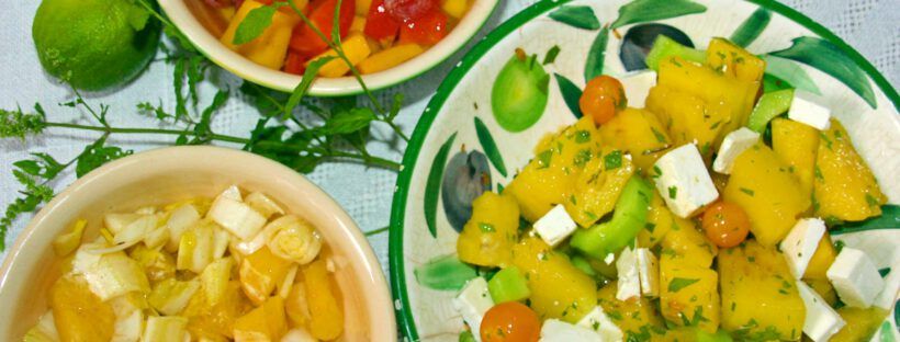 Melone und Mango sind eigentlich schon ein bißchen zu süß für Low Carb, aber wenns kein Baguette dazu gibt und Ketchup und Mayo selbstgemacht und ohne Zucker sind, ist so eine lecker-erfrischende Sünde schon mal drin. Mild-süßer selbstgemachter Himbeer- oder Erdbeeressig eignet sich immer super für diese fruchtigen Salate.