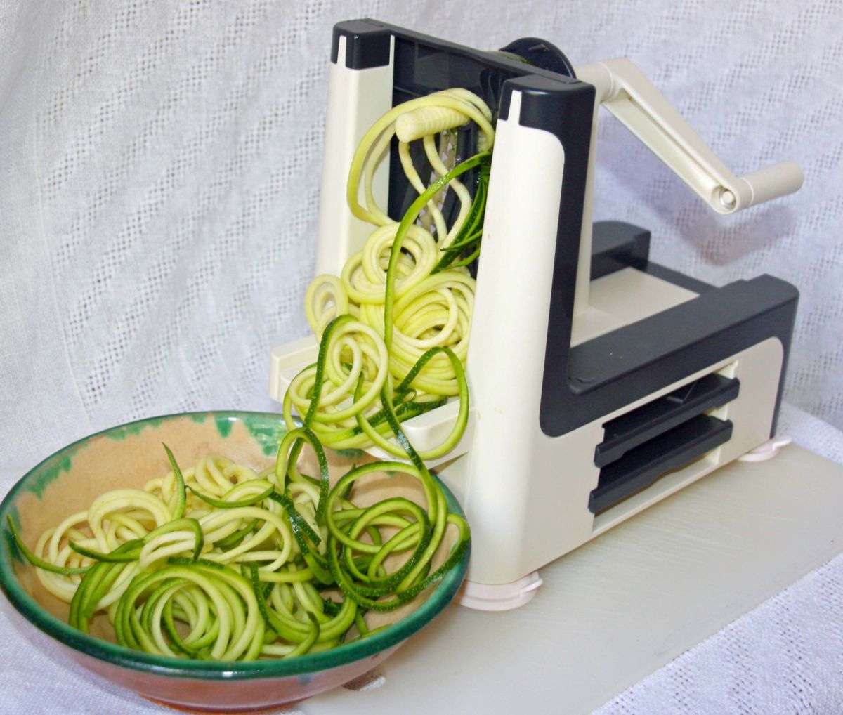 Dazu passen Linsennudeln oder Zuchininudeln (mein Arbeitsgerät).