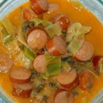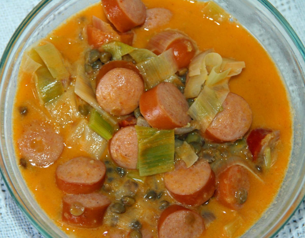 Zwiebeln andünsten, Lauch hinzufügen, einige Minuten weich dünsten. Ketchup, Senf und etwas Brühe hinzufügen, die Würstchen dazu, kurze Zeit köcheln, abschmecken.