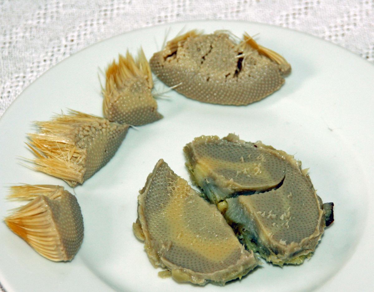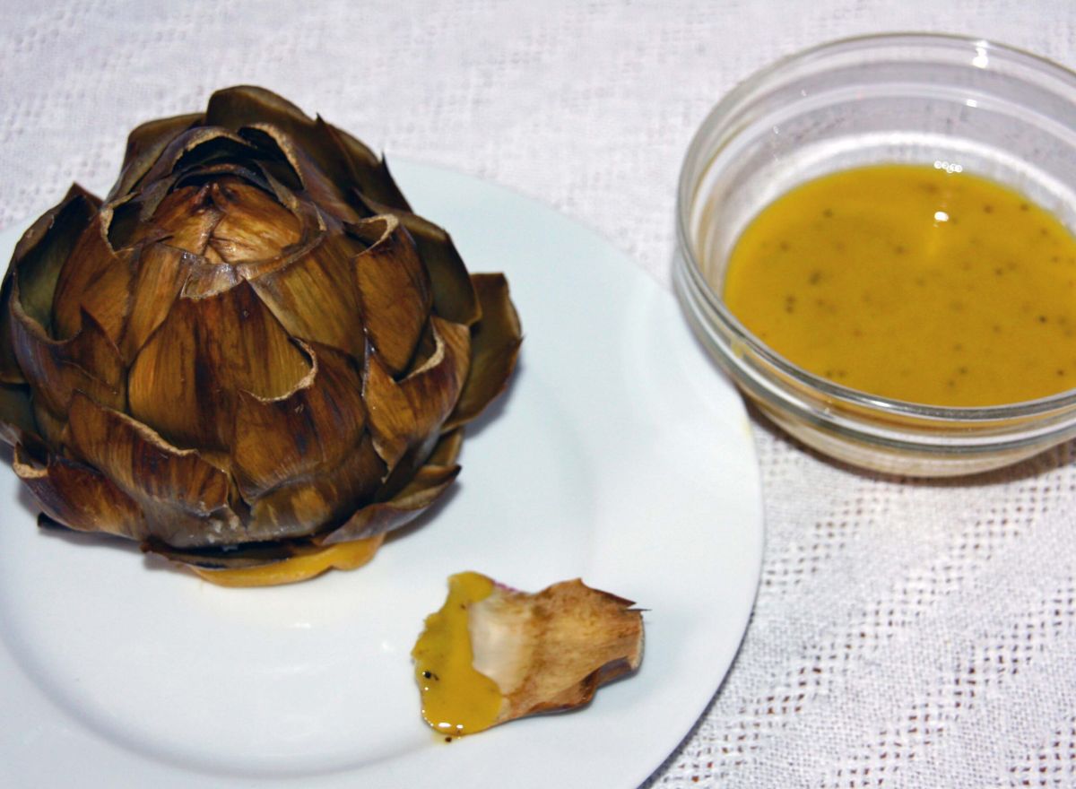 Die Spitzen der Artischocken abschneiden. Den Stiel dicht am Ansatz abbrechen (dabei die Artischocke festhalten und drehen, bis der Stiel sich löst). Eine Zitronenscheibe mit Küchengarn an den Boden binden und die Artischocken in einen Topf mit Wasser stellen. Ins Kochwasser kommt Salz, Zitronensaft und etwas Olivenöl. Ca. 40-45 Minuten leise köcheln lassen.  Abgießen.