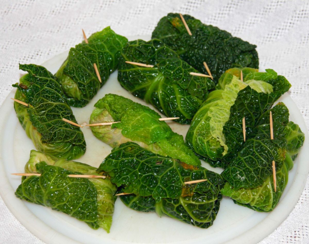 Die Blätter mit dem Spitze nach vorne auflegen, einen guten EL Füllung aufs untere Ende legen. Einrollen, die Seiten einschlagen und mit einrollen und mit einem Zahnstocher feststecken.