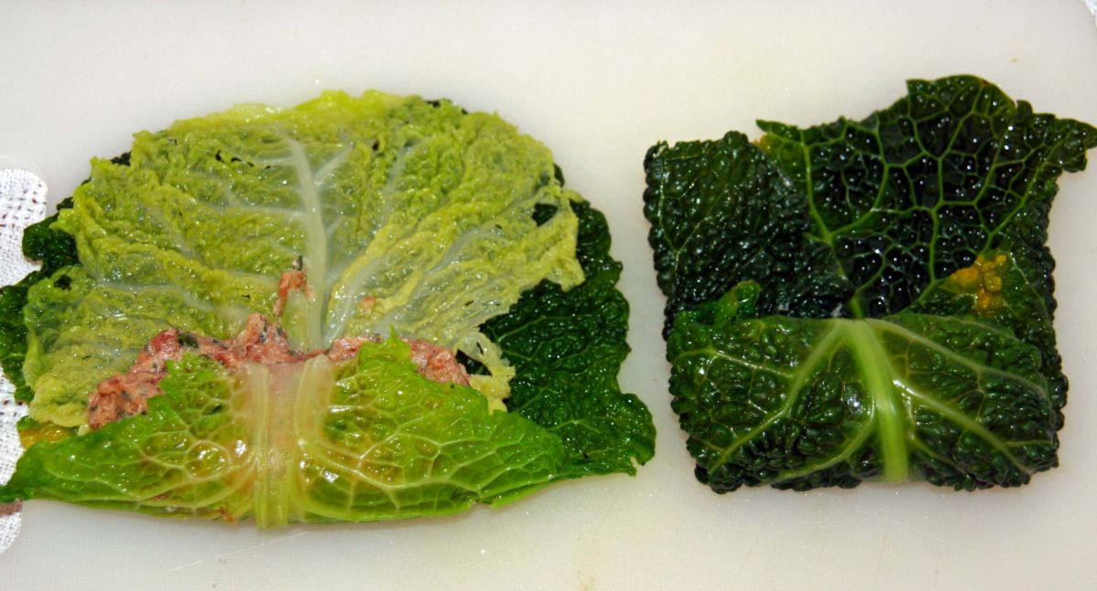 Die Blätter vom Wirsing vorsichtig ablösen und in kochendem Salzwasser kurz blanchieren (nicht zu weich, damit sie sich nicht auflösen, aber so weich, dass sie sich biegen lassen). Kalt abschrecken und die harten Strunkteile flach schneiden. Aus den Zutaten für die Füllung eine homogene Masse kneten. Das Wammerl in kleinere Stücke schneiden.