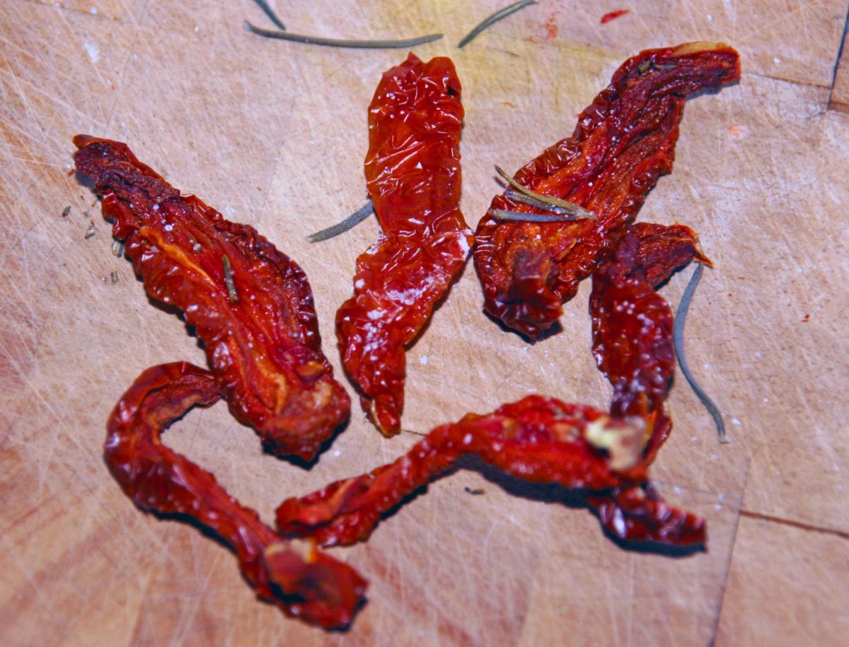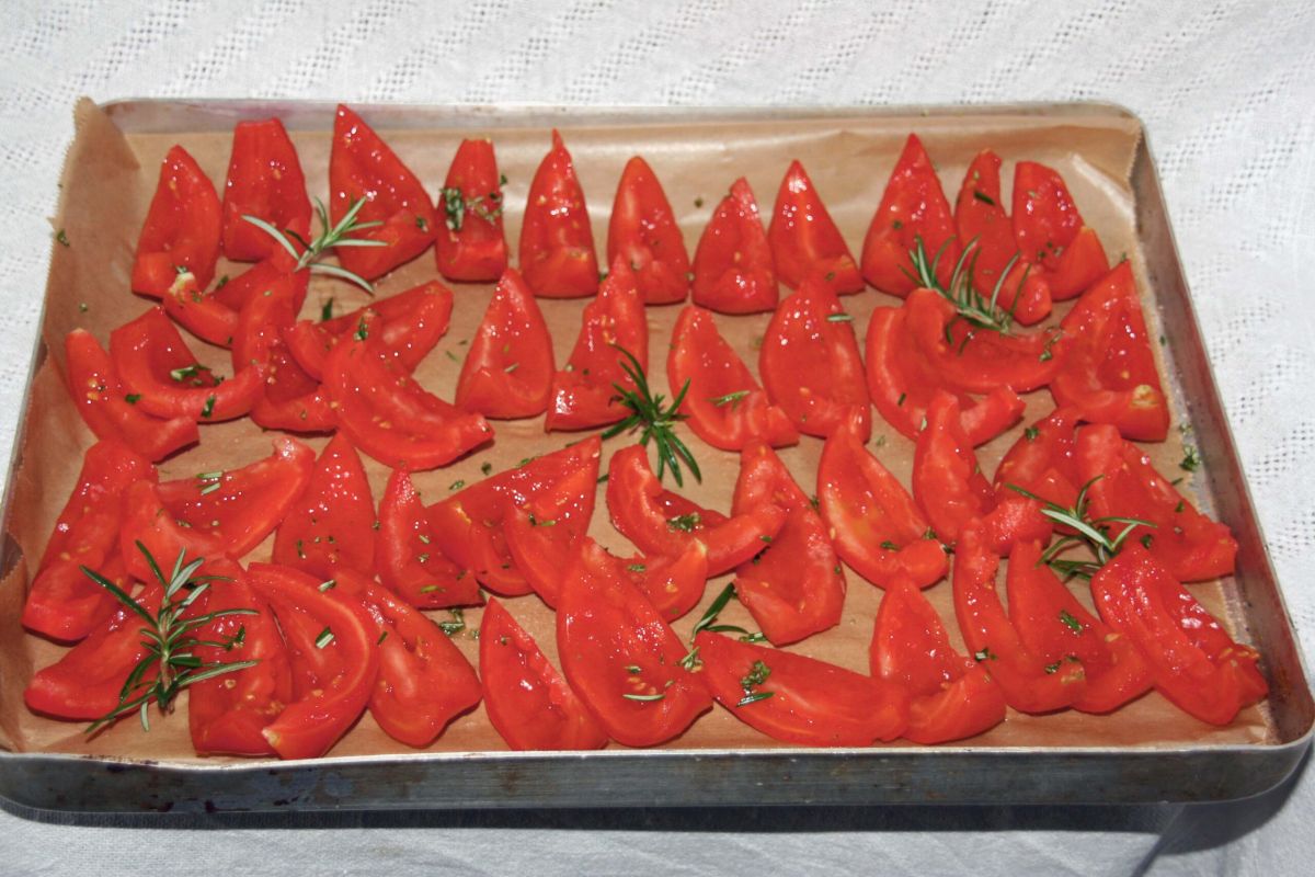 Je nach Größe die Tomaten halbieren oder vierteln. Das Fruchtfleisch und die Kerne entfernen, ebenso den weißen Stilansatz. Auf Küchenpapier abtropfen lassen. Dann aufs Backblech, das mit Backpapier ausgelegt wurde. Etwas Salz, Zucker und frischen gehackten Rosmarin darüberstreuen. Bei 90° Grad im Rohr für 4-5 Stunden trocknen, dabei einen hölzernen Kochlöffel in die Ofentür klemmen, damit die Feuchtigkeit abziehen kann. Die Tomaten sind fertig, wenn sie gummiartig sind, aber keine Flüssigkeit mehr austritt, wenn man sie zusammendrückt. Tomaten mit geschälten Knoblauchzehen in ein Glas schichten, 1 EL Salz darüber streuen und mit Olivenöl auffüllen, bis alles gut bedeckt ist.