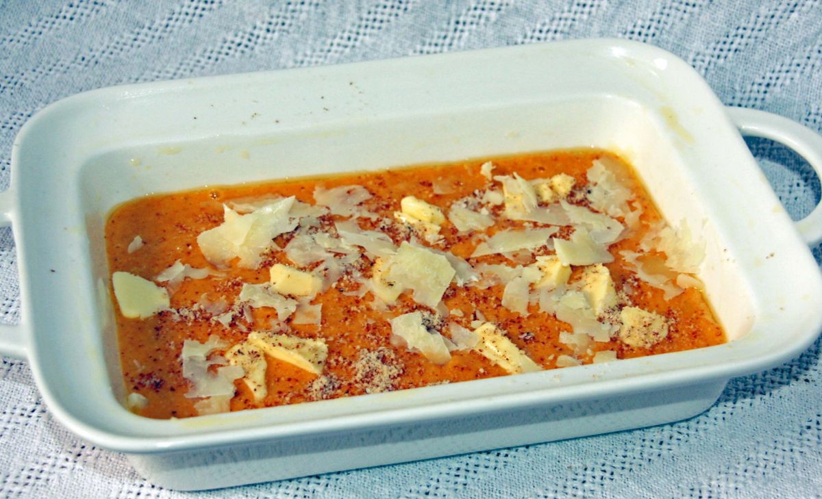 In eine gebutterte Auflaufform füllen, mit Mandeln, Parmesan und butterflöckchen bestreuen. Bei mittlerer Hitze ca. 30 Minuten stocken lassen.