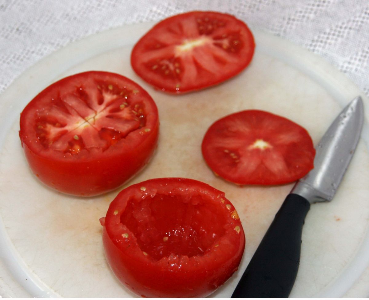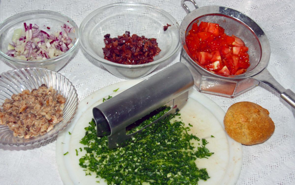 Tomaten waschen, Deckel abschneiden, aushöhlen und auf einem Kuchengitter, dem man ein paar Blatt Küchenpapier untergelegt hat, mit der Öffnung nach unten abtropfen lassen. Zwiebeln hacken, beiseite stellen. Petersilie mit dem Knoblauch fein hacken, beiseite stellen. Sardinen abtropfen lassen, kleinschneiden, mit Zitronensaft beträufeln, beiseite stellen. Das Tomateninnere (ohne Deckel) klein schneiden und in einem Sieb abtropfen lassen. Oliven entkernen, klein schneiden, mit den Kapern mischen, beiseite stellen.