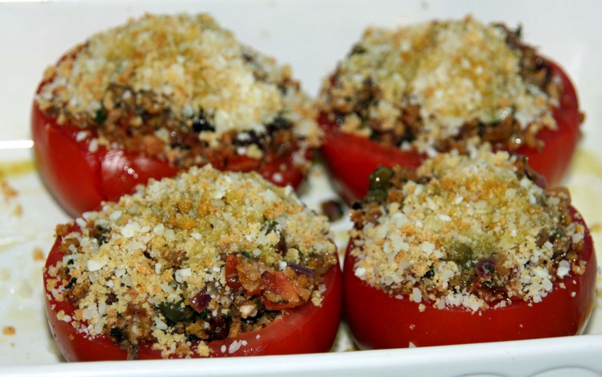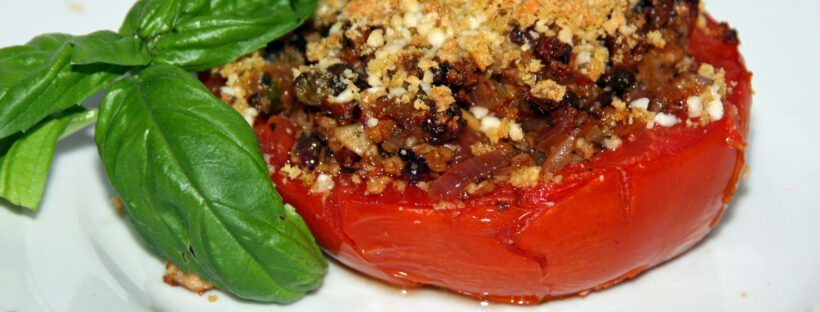 Die sizilianische Küche verwendet ja oft vielerlei Zutaten für ein einziges kleines Gericht, so auch hier. Die Füllung besteht oft aus Sardinen, Sardellen, Pecorino, Kapern, Knoblauch und Oliven, dazu noch Kräuter und Zwiebeln, die es zu Hacken gilt. Daher sind die Rezepte oft ein wenig zeitaufwendig. Aber das Ergebnis ist auf jeden Fall lohnenswert. Die Tomaten gehen gut als leichtes Abendessen zum Rotwein oder auch als Beilage zu gebratenem Fleisch.