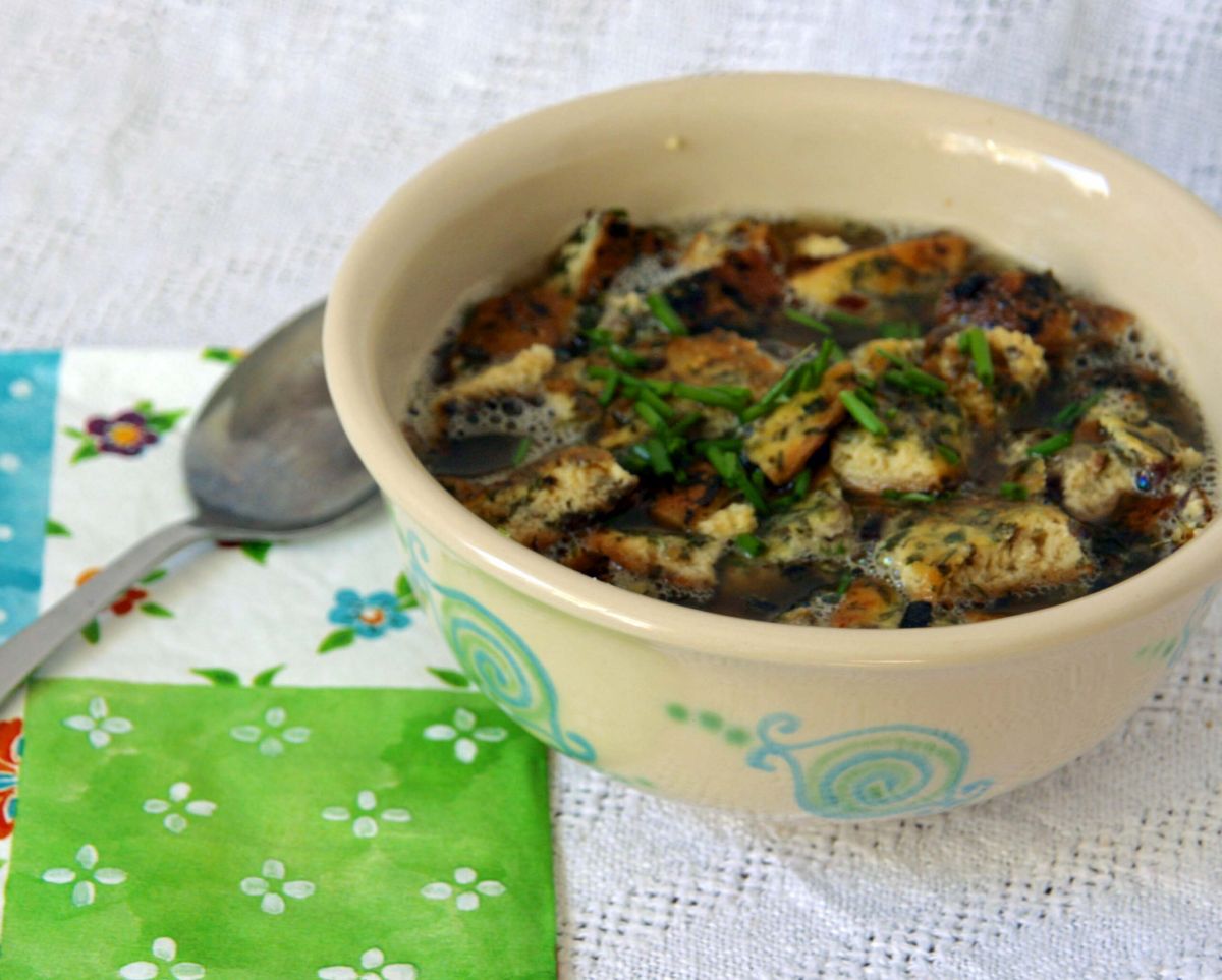 Zwiebel in der Pfanne in Olivenöl andünsten, die Kräuter dazu geben und leicht mitdünsten, 2 EL Zitronensaft darüber geben, umrühren und in der Pfanne gleichmäßig verteilen. Die Eier mit dem Parmesan verquirlen, mit Salz und Pfeffer würzen, über die Kräuter geben und bei milder Hitze stocken lassen (eventuell abdecken). Aus der Pfanne nehmen, etwas abkühlen lassen, dann in Streifen schneiden und in Suppenteller füllen. Mit heißer Brühe aufgießen und einigen Kräutern bestreuen.