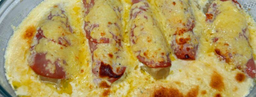 In eine gebutterte Form legen, mit je einer Scheibe Schinken umwickeln.