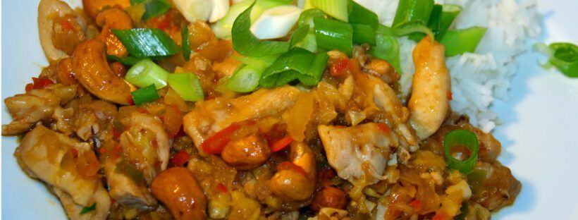 Ofen auf 150° Grad vorheizen. Kokosflocken auf einem Backblech hellbraun rösten, Blech immer mal wieder schütteln. Gesamt etwa 10 Minuten, beiseite stellen. Danach die Cashewnüsse auf dem Blech verteilen und 15-20 Minuten goldbraun rösten, ebenso beiseite stellen. Wenn alle Zutaten vorbereitet sind den Wok erhitzen, dann das Öl im Wok erhitzen und Zwiebeln, Knoblauch und Chilies unter Rühren einige Minuten weich braten.
