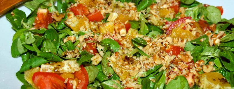 Feldsalat nochmal waschen und gut schleudern. Tomaten halbieren, die Hälften drei-teilen und dann quer in Stück schneiden. Die Orangen schälen, das Weiße möglichst entfernen und ebenfalls in Stücke schneiden. Walnüsse mit dem Wiegemesser grob hacken. In einer Schüssel anrichten.