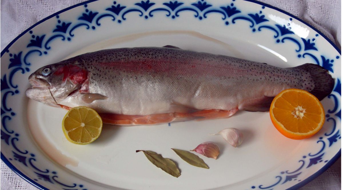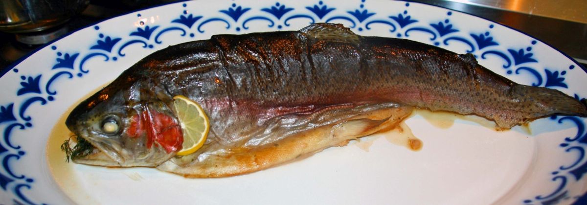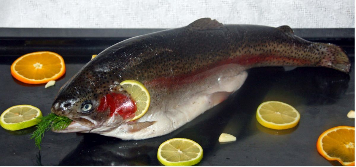 Eine Lachsforelle mit ca. 1,5 kg Gewicht ist nicht ganz billig. Der Edelfisch ist eine Forelle, hat aber eine rosa Fleisch wie ein Lachs. Er eignet sich für ein Essen zu einem besonderen Anlass wie z.B. einen Geburtstag.