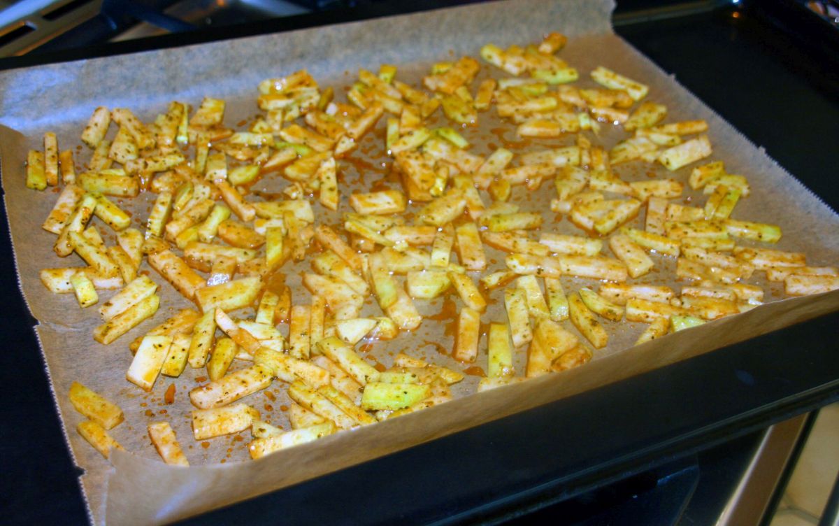 Die Kohlrabi in einer Schüssel mit Öl und den Gewürzen vermengen, auf ein mit Backpapier ausgelegtes Backblech verteilen und im Backofen bei ca. 170° Grad backen bis sie weich sind. In der Zwischenzeit die Zwiebel andünsten, kurz den Knoblauch mit rösten, dann das Hackfleisch zugeben und unter Rühren anbraten und mit Salz und Pfeffer würzen.