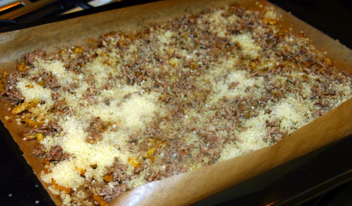Hackfleisch über den Kohlrabi verteilen, Parmesan darüber streuen und nochmal 10-15 Minuten überbacken.