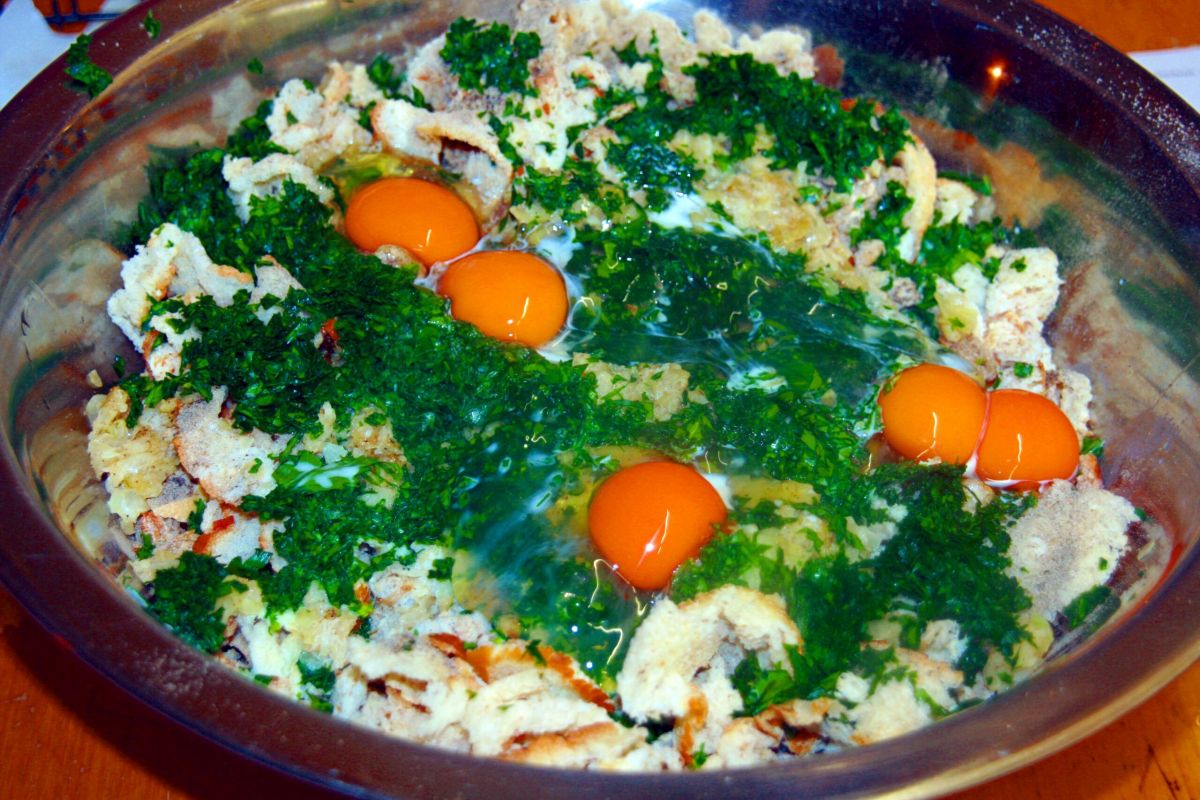 Zwiebel in Butter glasig dünsten. Mit der gehackten Petersilie und den Eiern auf das Knödelbrot geben. Salzen und pfeffern, wobei die Semmelknödel gerne gut gepfeffert werden. Durchkneten und mindestens 15 Minuten ruhen lassen. Knödel formen und in siedendem Salzwasser ca. 20 Minuten gar ziehen lassen.