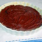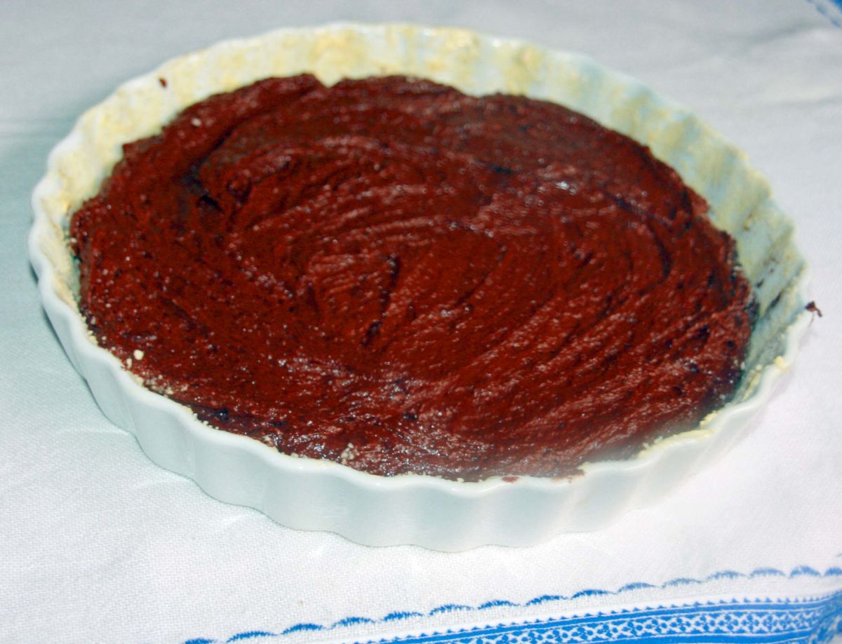 Die Tarteforme gut einfetten und mit 3 EL gemahlenen Mandeln ausstreuen. Schokomasse einfüllen und glattstreichen. Auf der 2. Schiene von unten ca. 20-30 Minuten backen und mindestens 1 Stunden auskühlen lassen.