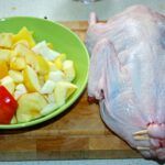 Die Ente innen und außen großzügig salzen und pfeffern, mit Äpfel und Zwiebeln füllen und mit Holzsteckern verschließen. Bei 140° bis 160° Grad ca 4 Stunden auf dem Rost braten. Dabei ab und zu mit Bratensaft begießen und wenden.