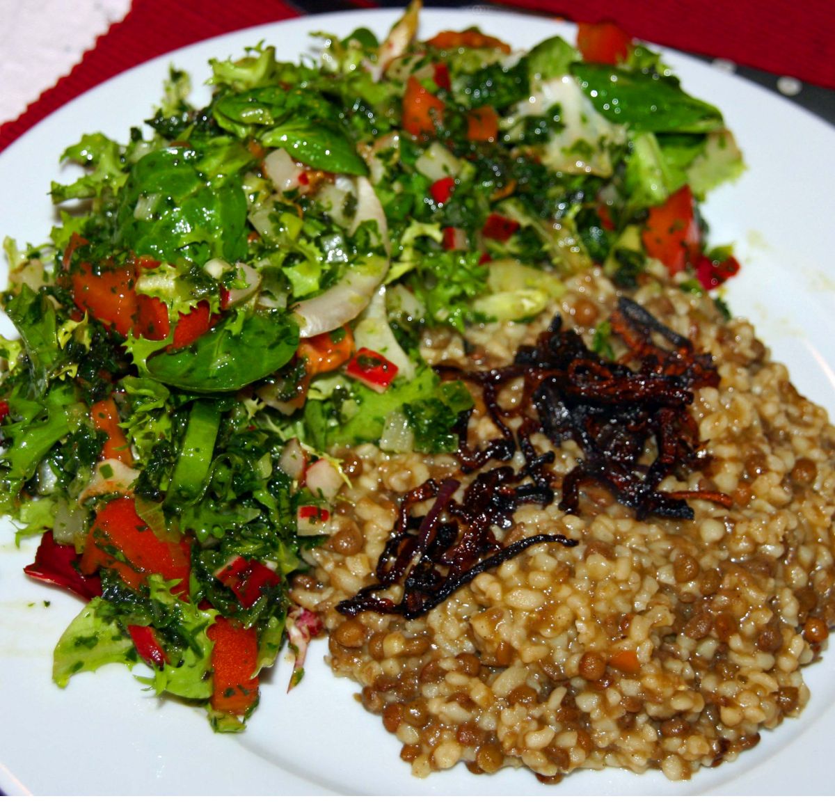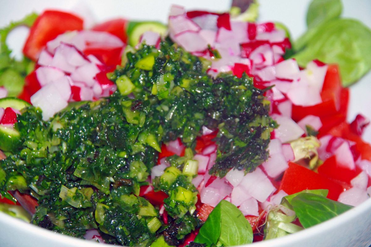 Tomaten würfeln, Gurken in kleine Scheiben oder Würfel schneiden, Salatblätter klein schneiden. Das Grün der Frühlingszwiebeln entfernen, den Rest klein hacken. Petersilie und Minze fein hacken, Radieschen in kleine Würfel schneiden. Alles in einer große Schüssel gründlich mischen und mit dem Dressing würzen.