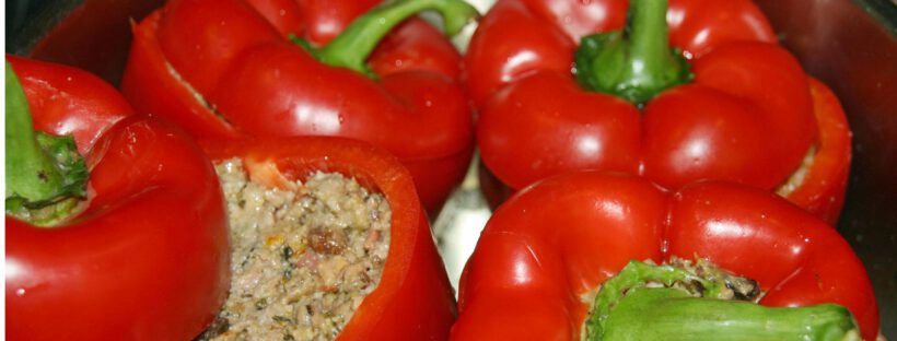 Die Butter in einem großen Topf schmelzen, die vorbereiteten Paprika (einen Deckel abschneiden, Kerne und Rippen entfernen) mit der Fleischmasse füllen und ohne Deckel in den Topf setzen. Die Fleischbrühe mit Sauerrahm und Petersilie mischen und über die Paprikaschoten gießen. Die Deckel wieder aufsetzen und auf kleiner Flamme zugedeckt ca. 30 Min garen lassen