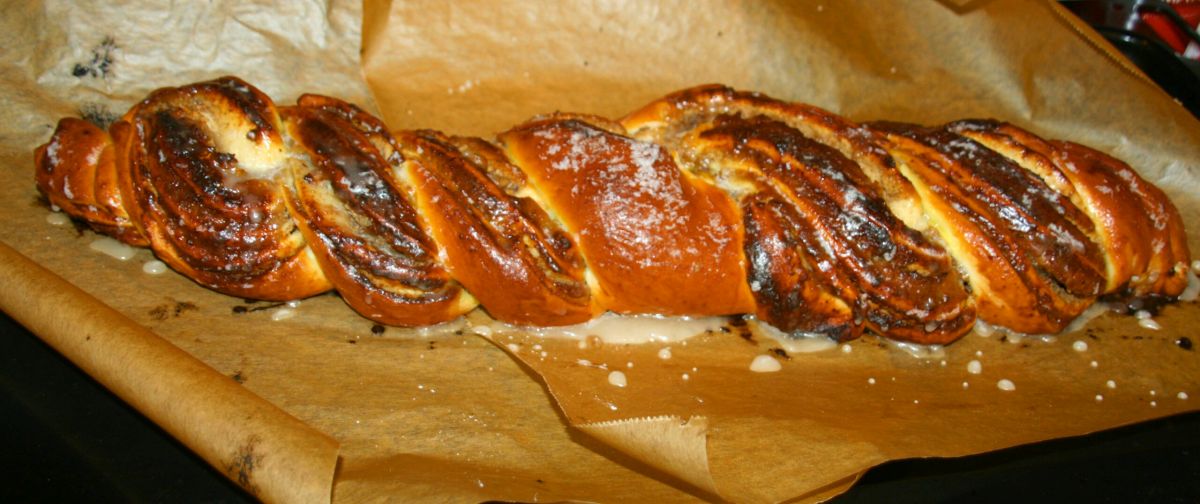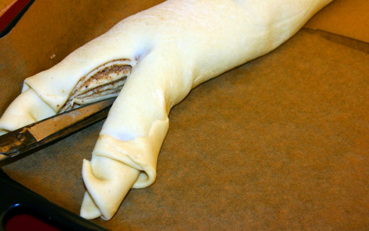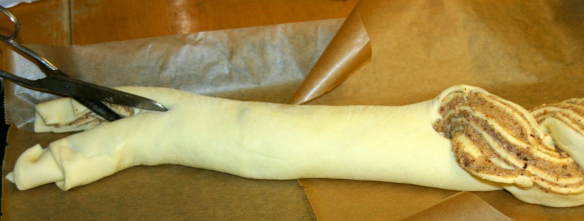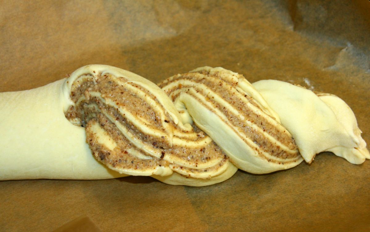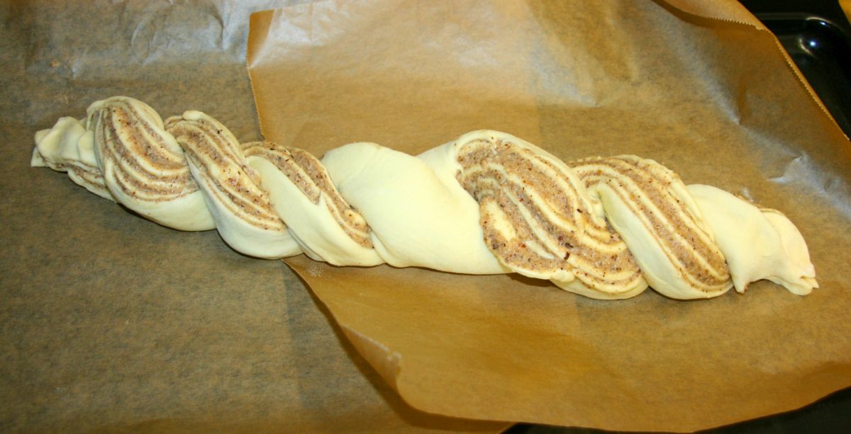 Dann mit der Nussfüllung bestreichen und längs aufrollen. Diese Rolle etwas mit Mehl bestäuben und vorsichitg diagonal aufs Blech legen.