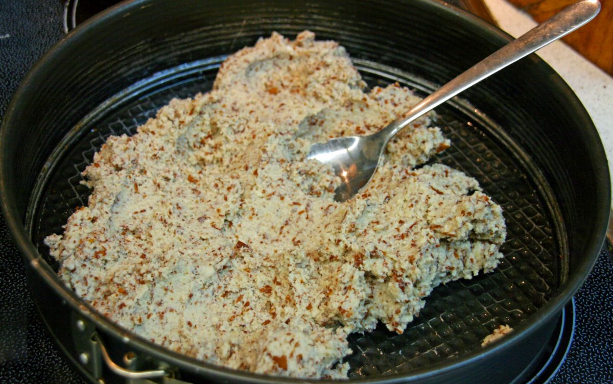 Mandeln über Nacht in kaltem Wasser einweichen. Alle Zutaten für den Boden in den Mixer und zu einer zähcremigen Masse verarbeiten. Springform ölen und die Bodenmischung einstreichen.