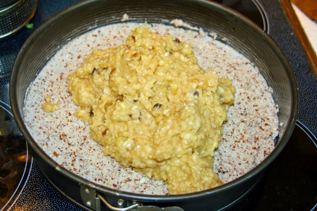 Äpfel und Bananen für den Belag zusammen mit den Rosinen und dem Zimt in den Mixer geben und häckseln (oder von Hand raffeln). Auf den Kuchenboden streichen. Mit Zimtxucker bestreuen.