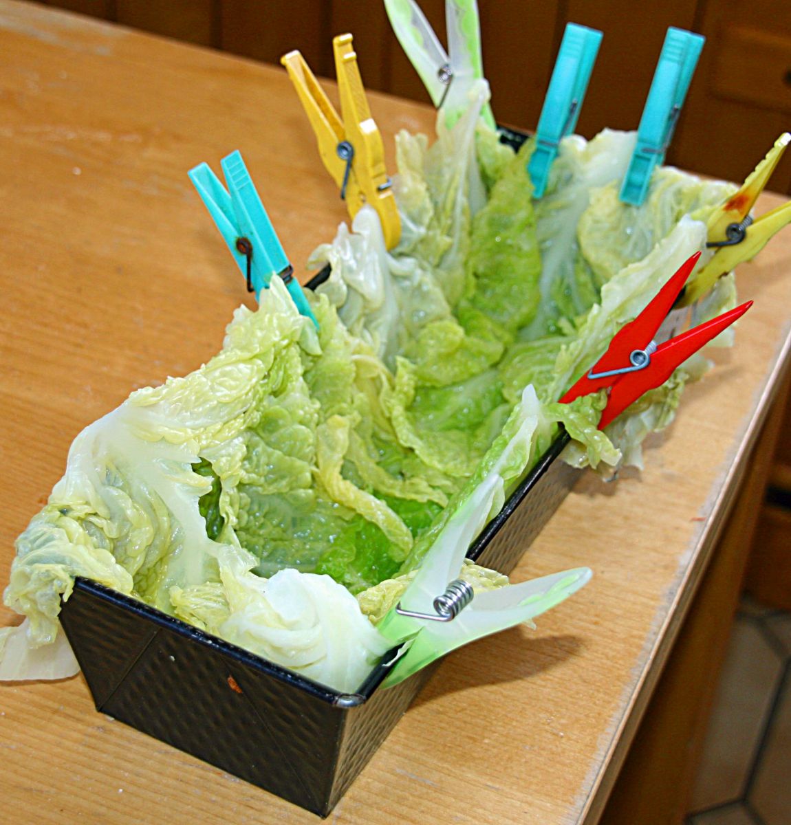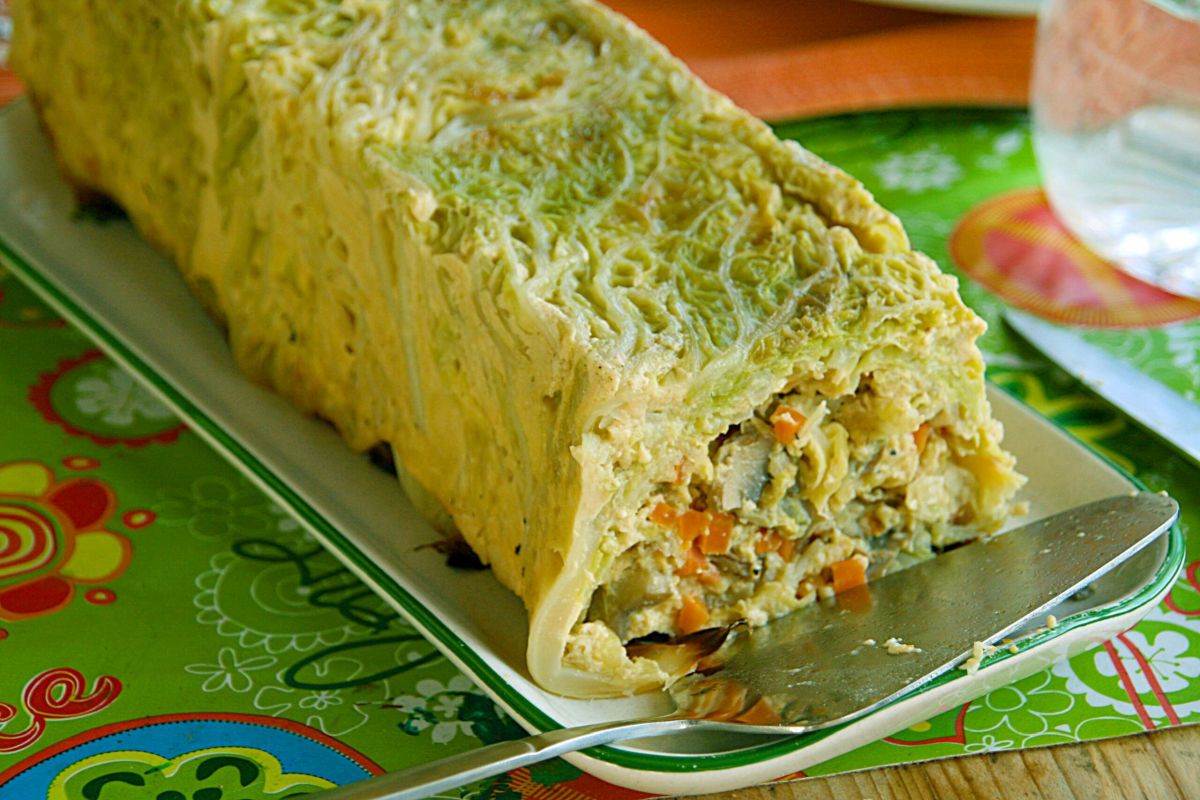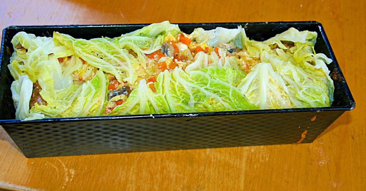 Wirsing putzen, ausreichend große Blätter abtrennen, um sie in eine Kasteform zu füllen. In Salzwasser 2-4 Minuten blanchieren, kalt abspülen und abtropfen. Die Blätter in eine gefettete Kastenform legen, sie sollen überhängen mit dem Stiel nach oben (ich pinne sie mit Wäschklammern fest). Den restlichen Wirsing in feine Streifen schneiden oder im Mixer zerkleinern. Pilze mit etwas Salz ohne Fett in der Pfanne „entwässern“ (erst Deckel drauf, dann, wenn sie Wasser gezogen haben, Deckel wieder runter und verdampfen lassen). Wenn alle Flüssigkeit weg ist, Fett dazugeben (Olivenöl, Butterschmalz) und die Zwiebel zufügen, alles anbraten, dann beiseite stellen. Ggf. nochmal Fett in die Pfanne, die Karottenwürfel zugeben, den Wirsing dazu, etwas Salz dazu, anbraten und einige Minuten dünsten. Zitronensaft und Kräuter unterrühren, mit den Zwiebeln und Pilzen mischen.