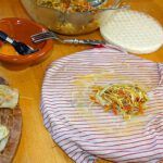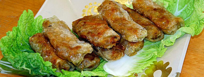 Über ein Schneidbrett ein feuchtes sauberes Geschirrtuch geben. Zwei Teigblätter einweichen (ca 1 Min), dann auf einem weiteren trockenen Tuch kurz abtrocknen, auf das Brett legen, den Rand mit Ei bepinseln, 1 Esslöffel Füllung in die Mitte geben, 2 Seiten einschlagen und aufrollen.