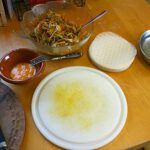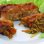 Glasnudeln in kochendem Wasser 3-4 Minuten kochen lassen, abgießen und in kleine Stück schneiden (Kurz in den Mixer geht auch, dann haben sie die richtige Länge von 2-3 cm). Die Reisvermicelli in kaltem Wasser einweichen und ebenfalls in kleine Stück schneiden. Beide Nudelsorten mit dem Gemüse vermengen. Das Hackfleisch wieder untermischen. Alles abkühlen lassen.