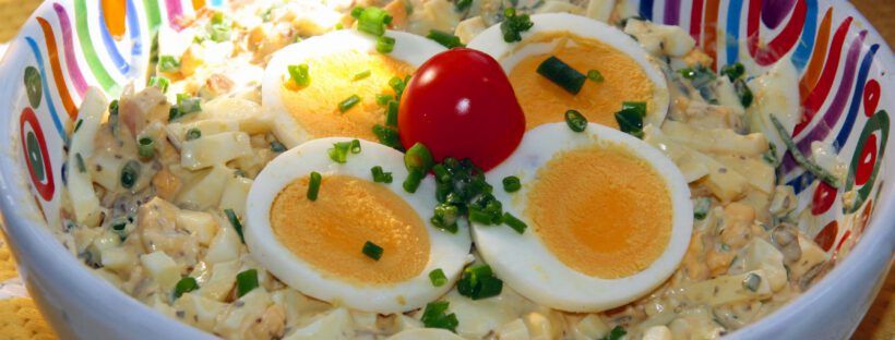 Die Eier einmal quer und einmal längs durch den Eierschneider schicken. Einige Scheiben zur Deko übrig lassen. Mit den restlichen Zutaten mischen und abschmecken.
