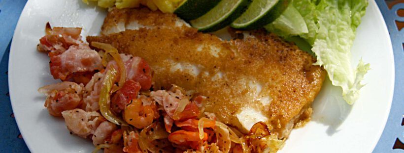 Diese Zwiebel-Bacon-Krabben-Beilage kann als Füllung in einen ganzen Fisch, z.B. traditionell in eine Scholle kommen, oder man reicht sie wie hier zum gebratenen Fisch dazu.