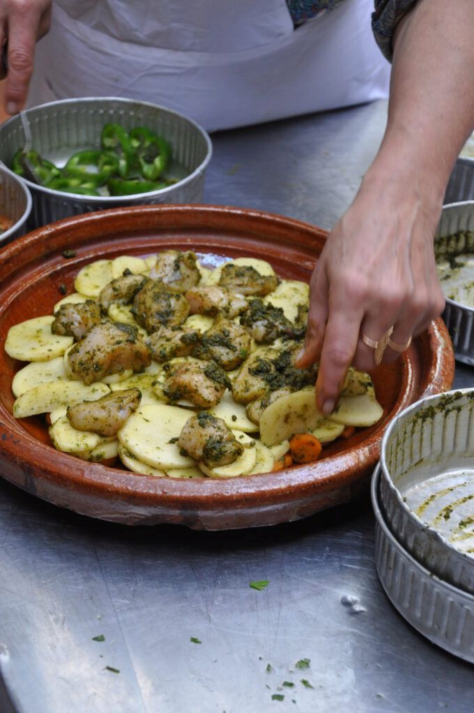 Reinigung: Niemals wird mit Spülmittel gereinigt, sondern nur mit heißem Wasser und Metallkratzer. Um Geschmacksrückstände zu vertreiben, legt man die Tadjine in Essig- oder Zitronenwasser ein.