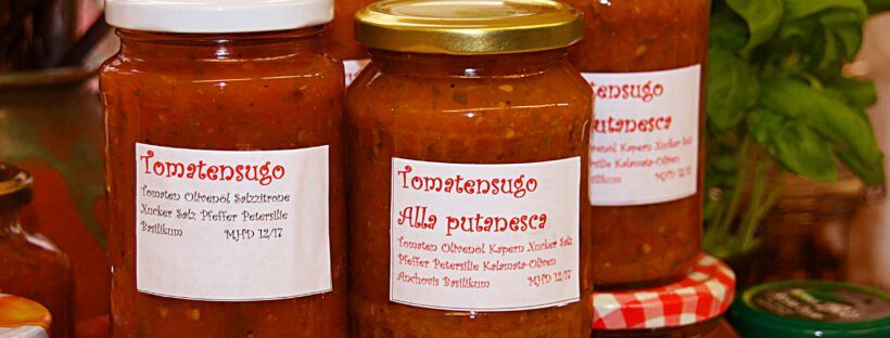 Jetzt im August gibt es Tomaten wieder sehr günstig auf dem Markt. Da lohnt es sich doch, auf Vorrat diverse Tomatensaucen ein zu kochen. Ich habe diesmal zweierlei gemacht, einmal die „ganz normale“ und einmal die puttanesca. Diese „Tomatensauce nach Hurenart“ (von italienisch putane = Hure) setzt sich aus mehreren haltbaren Zutaten zusammen und ist relativ schnell zubereitet. Die Schärfe habe ich hier weggelassen, sonst essen es die Kinder nicht. Es kann ja jeder nachschärfen.