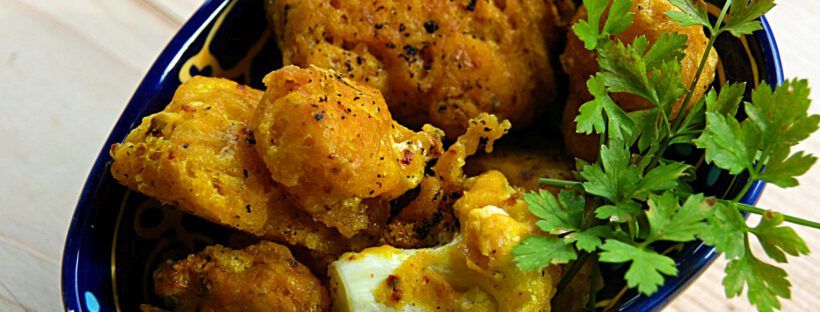 Low Carb ist das Ganze nicht. Zum einen ist Mehl im Rezept und die Umhüllung saugt auch ziemlich viel Fett auf. Umso wichtiger ist es, ein gutes Fett zu nehmen, also keine gehärteten Transfette, sondern am besten Kokosöl. Das passt auch gut zu den Gewürzen wenn es nicht geschmacksneutral ist, also noch einen leichten Kokosgeschmack hat. Ein großes Glas darf man einplanen. Dafür machen die frittierten Röschen auch ziemlich satt. Noch ein dicker griechischer Joghurt (10%) oder ein Raita dazu, wunderbar!