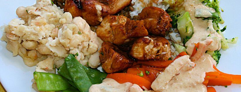 In eine Bowl oder auf ein Teller schichten, mit dem Dressing garnieren.
